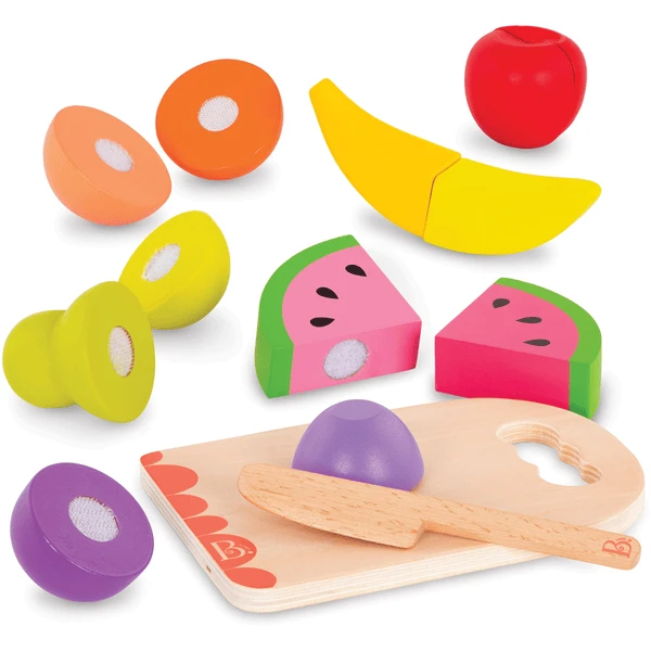Dieses kunterbunte Obst-Set von B.Toys ist eine tolle Möglichkeit für Ihr Kind, um verschiedene Nahrungsmittel kennenzulernen. Das „Schneiden“ fördert die motorischen Fähigkeiten und macht dank des realistischen „Crunch“-Geräuschs richtig viel Spaß. Eine tolle Ergänzung für jede Spielküche!Inhalt: 1 Pflaume, 1 Birne, 1 Apfel, 1 Orange, 1 Banane, 1 Wassermelonenscheibe (jeweils halbiert), 1 Schneidebrett, 1 SpielmesserGröße Produkt (cm): 31 x x Größe Verpackung (cm): 22 x 6,99 x 31,04